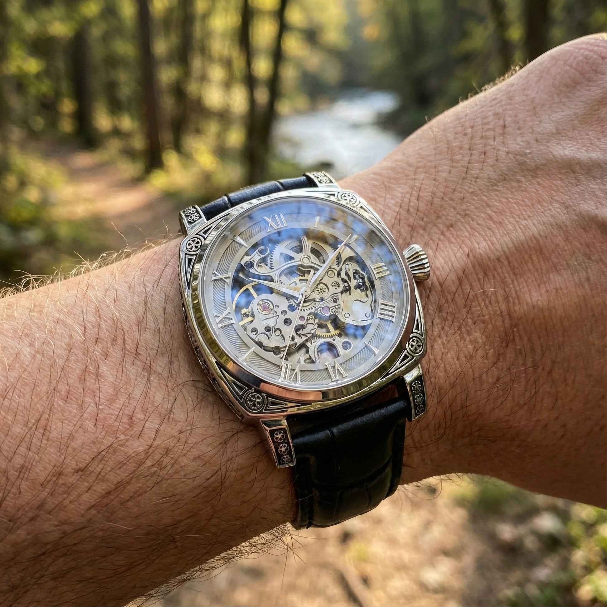 The visible mechanical movement serves as a conversation piece, distinguishing this watch from mass-produced alternatives and appealing to those who value craftsmanship and mechanical authenticity.