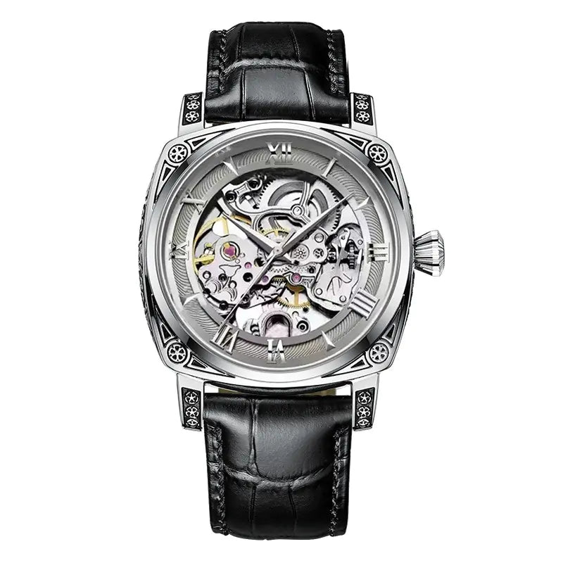 Visual Engineering: Showcases an intricate skeleton automatic movement visible through both the front crystal and the transparent caseback.
