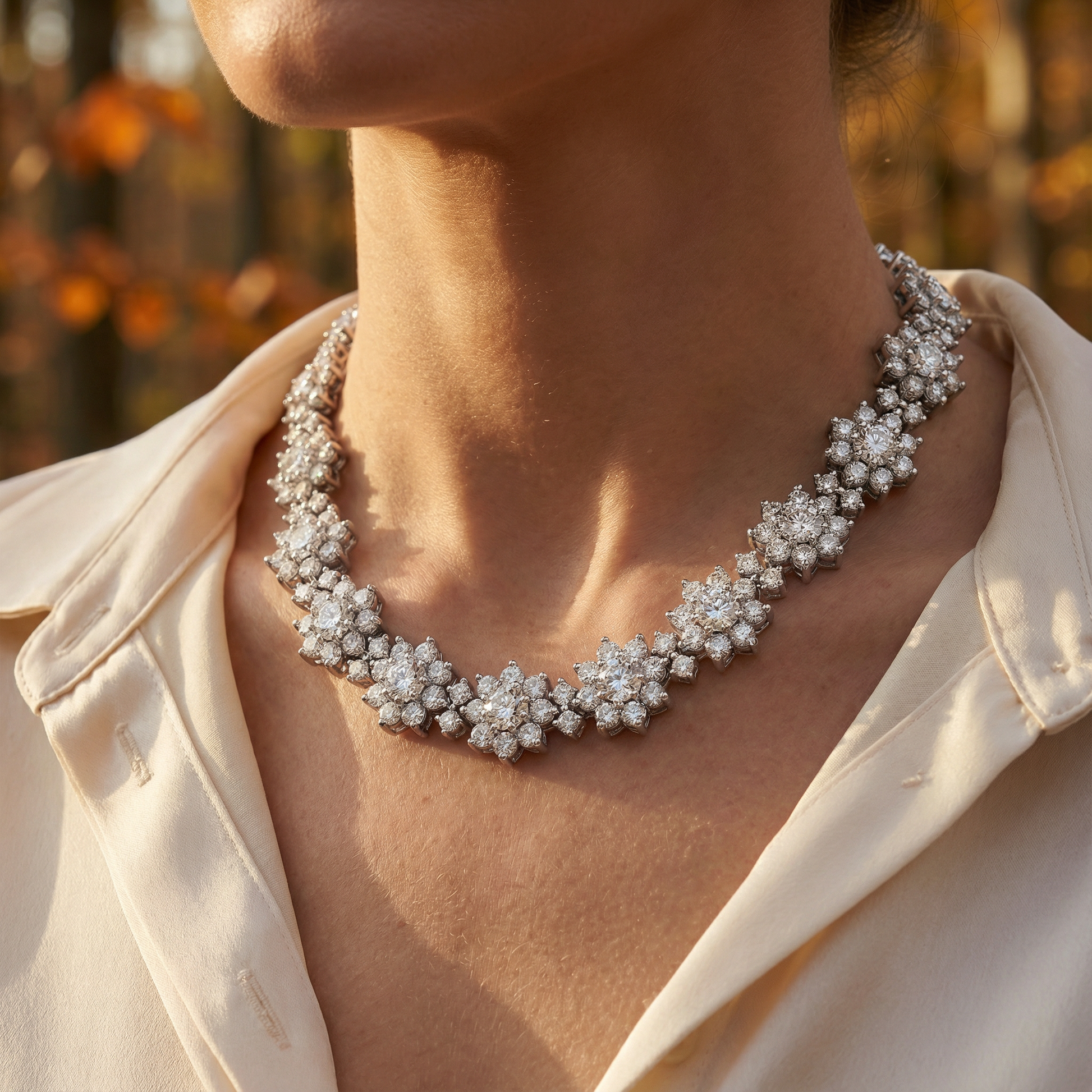 This necklace is crafted to be a true eye-catcher. We use the best materials, all selected specifically for its unmatched ability to capture and reflect light. Every element is precision-polished to ensure it delivers maximum brilliance that lasts. It's the piece that guarantees you'll shine beautifully, whether you're under spotlights or sunlight.